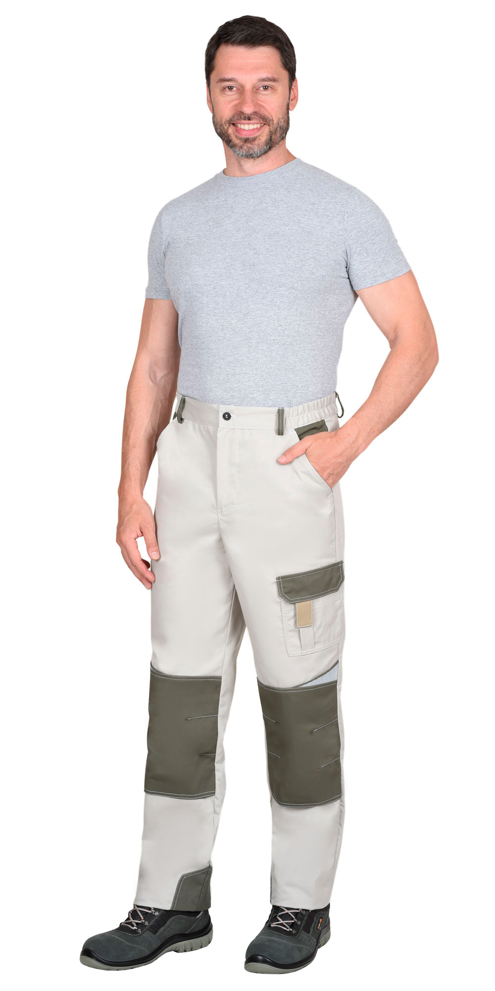 Брюки КАСПИЙ молочный с оливой и песочным и СОПЦена: 1900,00 руб. Брюки с застёжкой гульфика на тесьму «молния», с притачным поясом, застегивающимся на пуговицу, частично стянутым резинкой ткацкой по бокам. Изделие с различными многофункциональными карманами и объёмными наколенниками. В брюках предусмотрена фигурная лента светоотражающая СОП для обозначения сигнальной видимости. |
